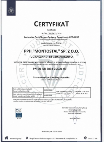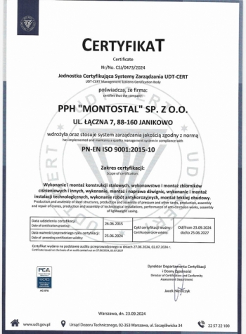 Montostal Sp. z o.o. dysponuje szerokim zakresem certyfikatów i uprawnień technicznych, które potwierdzają najwyższą jakość usług, zgodność z wymaganiami UDT, normami ISO oraz międzynarodowymi standardami w zakresie prefabrykacji, spawania i montażu instalacji przemysłowych. Dzięki nim zapewniamy naszym klientom bezpieczeństwo, profesjonalizm i zgodność z przepisami branżowymi.